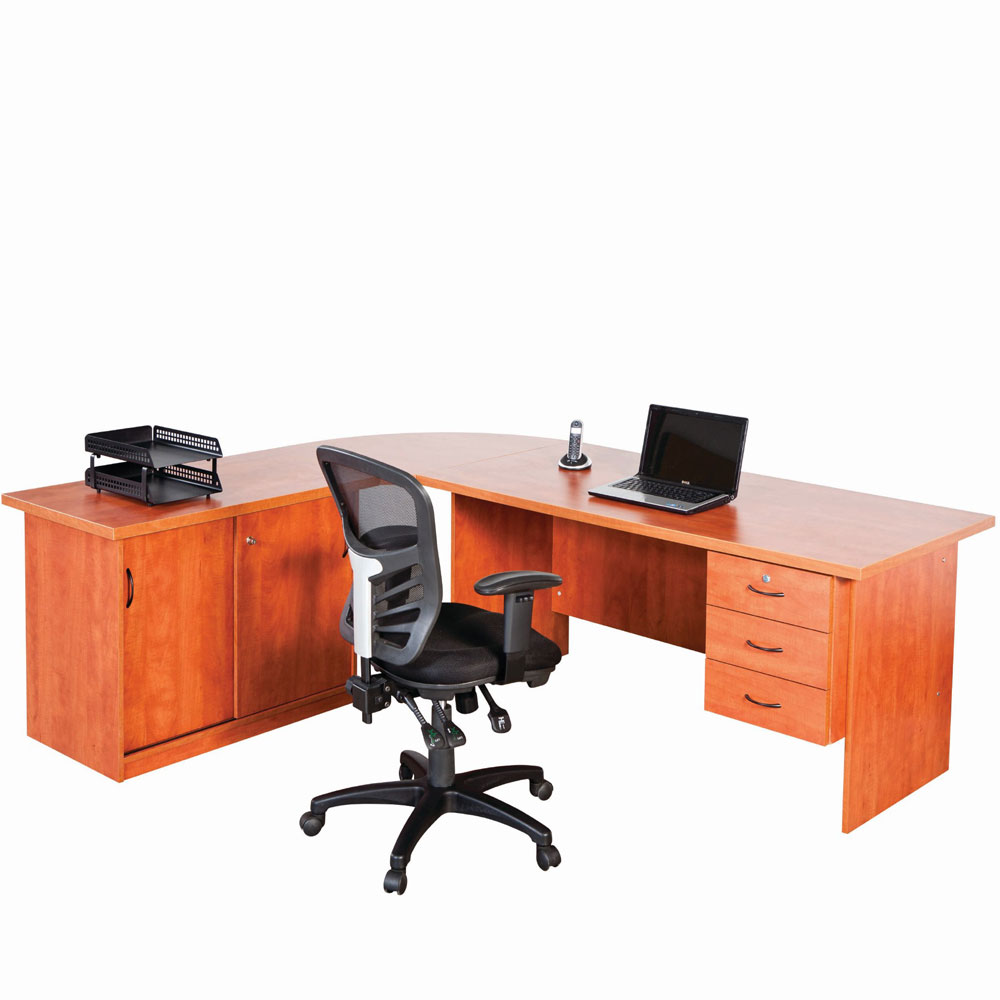 Melamine 32mm top with 32 x 2mm impact edge 2000 x 600 Executive Curve Desk 1200 x 600 Roller Door Credenza 3 Drawer Mobile Pedestal