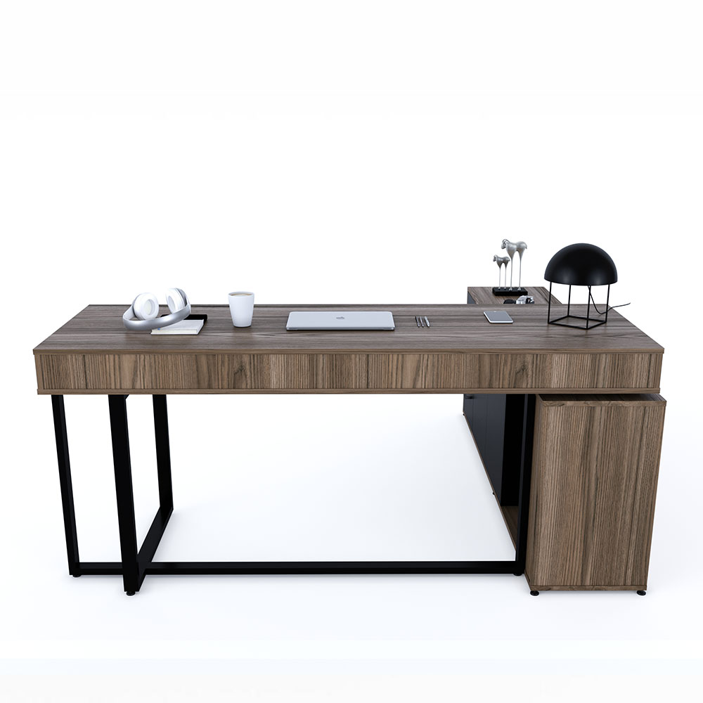 2000w x 900 32mm Melamine Top with 38 x 38mm Steel Underframe and Angled Oak Leg 1800w x 500d Pedenza Consisting of 2 Drawer Pedestal Unit with Open Top Shelf, Hinge Door Cupboard and CPU Consol Steel Frame Colours: Black, White, Silver. Other Colours on Request