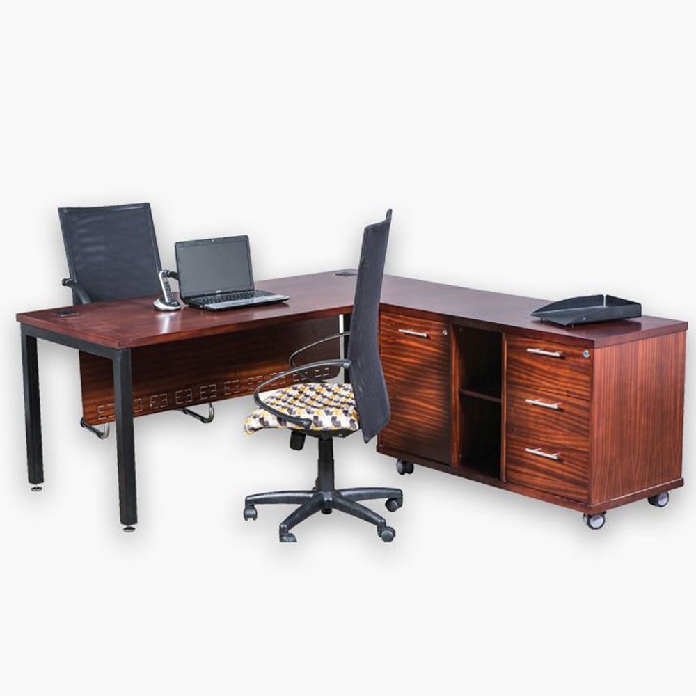 Melamine 32mm tops with 32 x 2mm impact edge. 50mm steel epoxy frame. Managerial Workstation with Mobile Combination 1800 x 800 Credenza