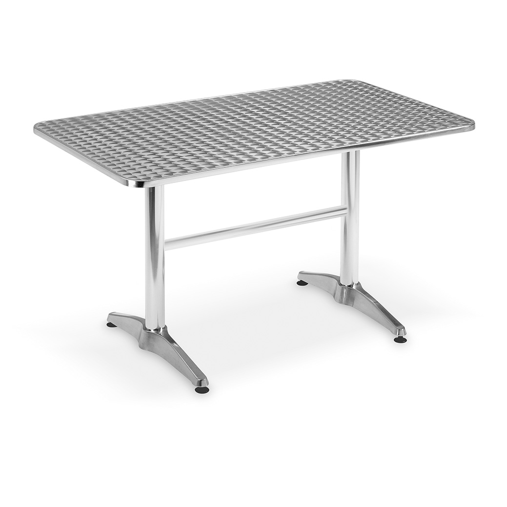 Size: 700 x 1200 x 710 high Aluminium poles with cast aluminium base Stainless steel top wrapped over superwood No edging around table Not to be left in the rain