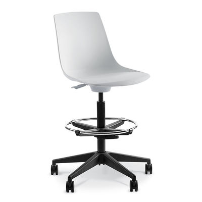 Polyprop shell on Black nylon five star base with swivel, gas height adjustment and adjustable footring. Ideal for cashier, teller or draughting applications. Castors standard, glides optional.