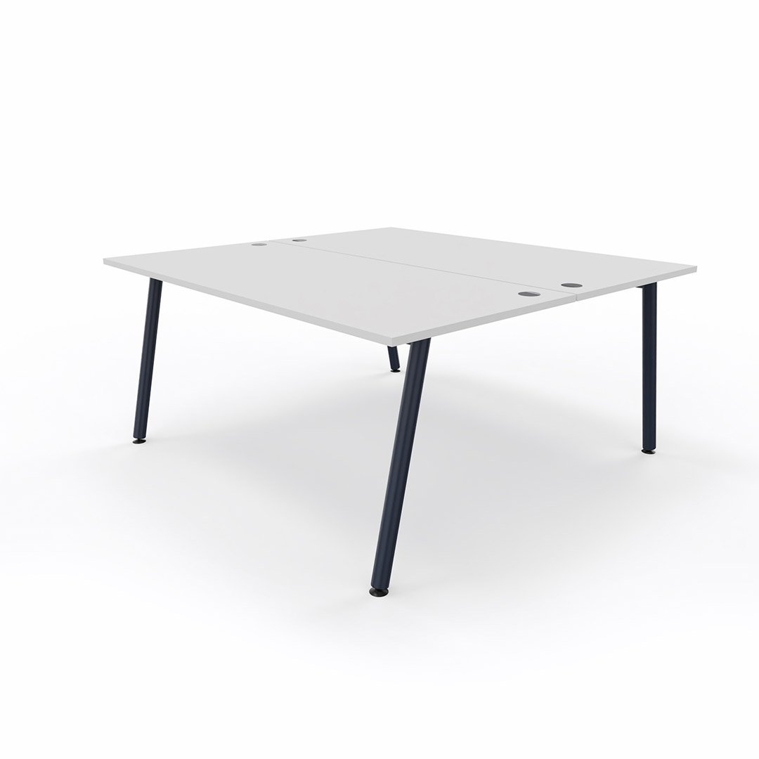 A round angled leg, with swivel foot and a 22mm table top with an overhang including cable ports and cable tray.