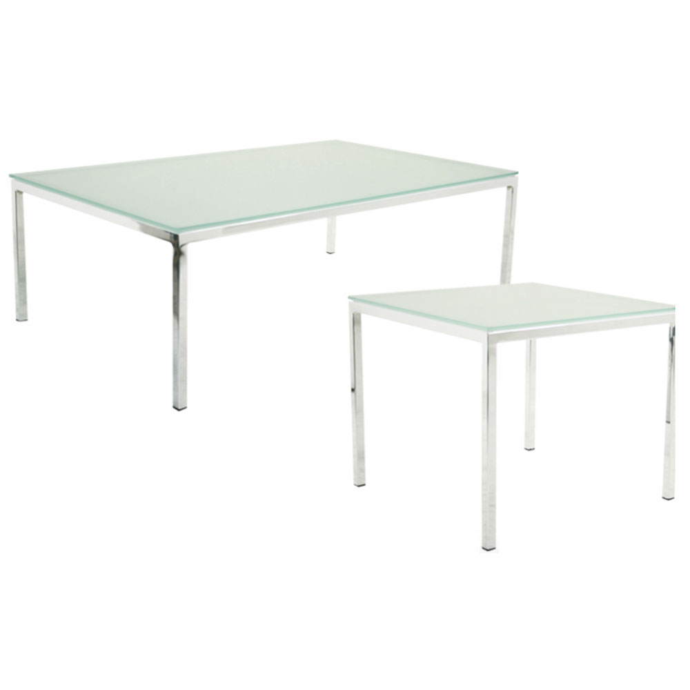 Size: 720 x 720 x 450 high Two level – 10mm tempered glass (BIFMA Aproved) Chrome frame